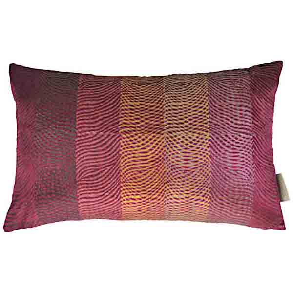 Fluwelen patchwork kussen met een grafische print. Dit kussen heeft warme complementaire kleuren en een handzaam formaat. De achterkant van het kussen is gemaakt van katoenen chambray. Het kussen wordt geleverd met binnenkussen.