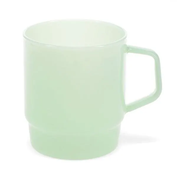 Glazen mok met licht groene tint en fijn oor, stapelbaar en perfect voor koffie, thee of warme choco.